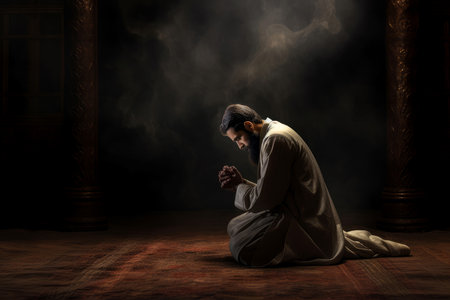 Religious muslim man praying in the church with rays of light