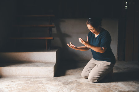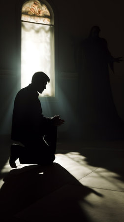 person kneeling in repentance and contrition, seeking forgiveness and renewal through prayer and faith. Generative AI