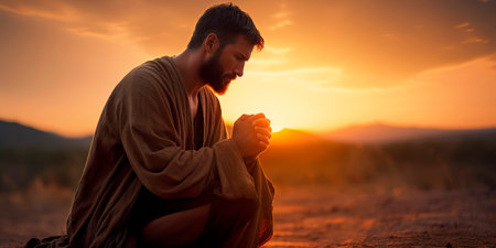 Man on his knees praying with folded hands under golden sunset sky, symbolizing faith, humility, and worship.