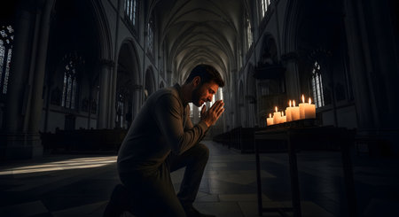 Man praying in the church at night with candles in the background.