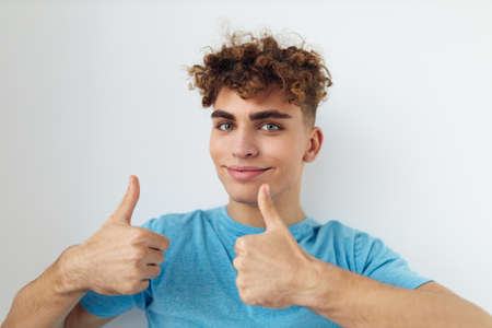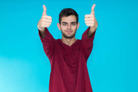 Portrait of handsome man approving doing positive gesture with hand, thumbs up for success. Good looking caucasian man looking at the camera, winner gesture