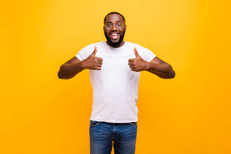 Portrait of attractive cheerful guy showing two thumbup ad advert solution isolated over bright yellow color background