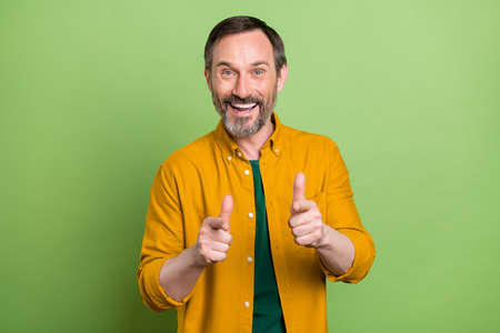 Photo of confident attractive mature man dressed orange shirt smiling pointing fingers you isolated green color background