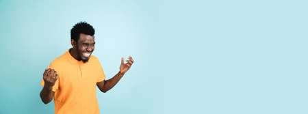 African mans portrait isolated over blue studio background with copyspace. Flyer
