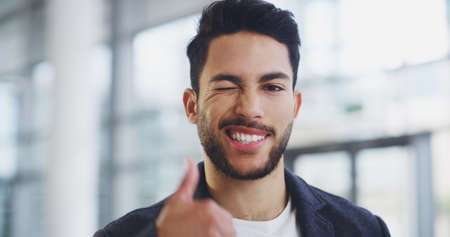 Its a great day for business. Cropped shot of a young businessman showing winking and showing thumbs up while walking through a modern office.