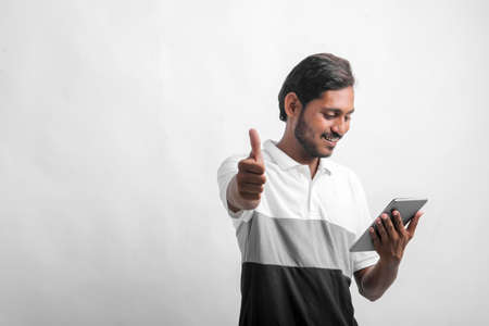 Photo image portrait of funny attractive cute young Asian man in white shirt smiling and showing thumbs up sign, half body portrait with selective focus