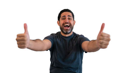 Happy joyful young man in a black t-shirt showing thumb up, isolated on white background.