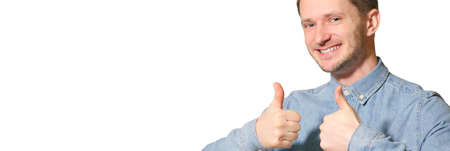 Smiling man in t-shirt and denim vest pointing with finger isolated on blue, banner