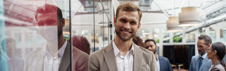 Smiling handsome businessman standing in office and looking at camera on colleagues background