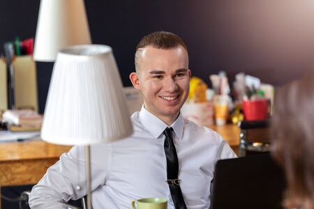 Portrait of a young man sitting at a table in the office and working on a computer. Co-working, business. Business and entrepreneurship concept