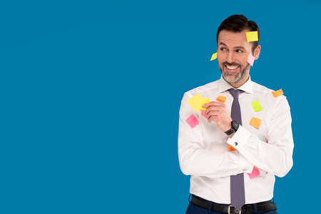 Handsome smiling male businessman in formal clothes posing over blue studio background, a lot of stickers on his body. Success. Worker. Real people.