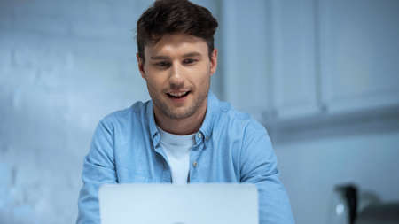 Caucasian man working with laptop at home office workplace. Freelancer remote work