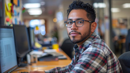 Engaged professional working diligently at a modern office desk in a collaborative environment during daylight hours