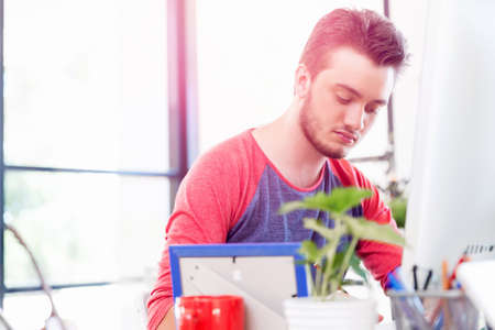 Professional male designer planing his project while using tablet in comfortable workplace