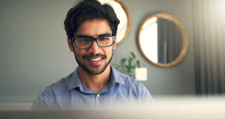 Business, online reading and man with smile, internet and newsletter for company website. Creative agency, employee and person in workplace, face and happiness with positive review, email or feedback