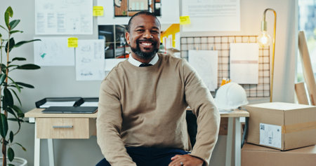 Portrait, black man and happy in office for architecture, career pride and opportunity for housing development. Mature engineer, smile and confident in firm for small business, creative or renovation