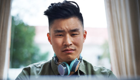 Close up of Casual Young Man Working on Laptop