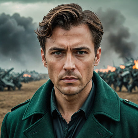 Futuristic Warrior Intense Closeup of Man in Green Coat on Battlefield