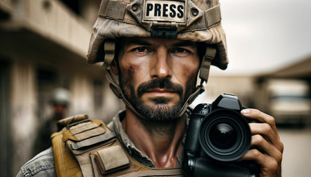 A man in a military uniform holds a camera. The man is wearing a press helmet. Military photojournalist concept.