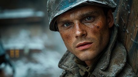 A soldier's determined expression reveals his grit in a snowy war setting.