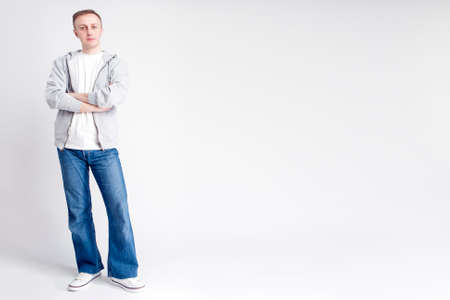 Full Length Portrait of Caucasian Man in Casual Clothing Posing Against White Background. Horizontal Image