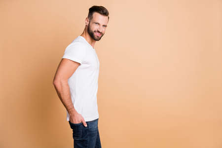 Profile side view portrait of content attractive cheerful guy going copy space ad isolated over beige pastel color background
