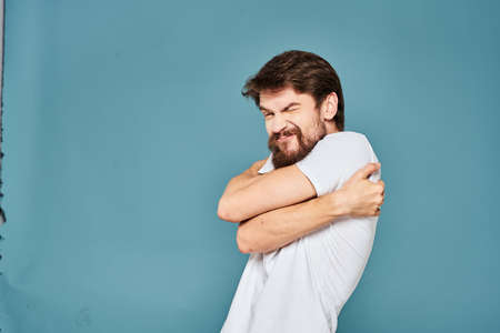 A bearded man in a white T-shirt gestures with his hands emotions blue background