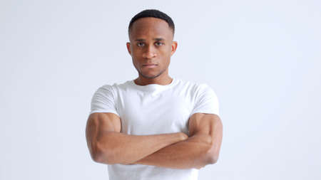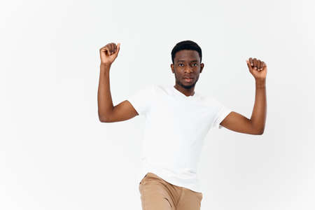 Happy African American man in white t-shirt isolated on white background Studio stand posing