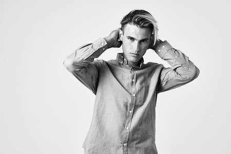a man with a fashionable hairstyle in a white shirt attractive look model