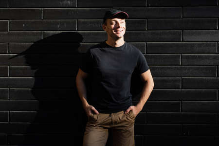 Hipster handsome male model with beard wearing white blank t-shirt and a baseball cap with space for your logo or design in casual urban style