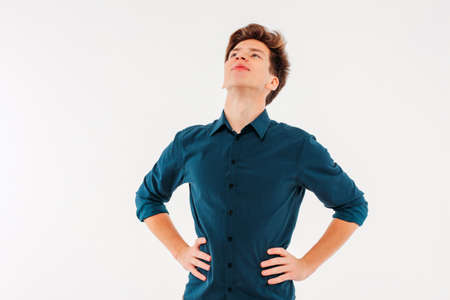 Portrait of smiling dreaming thoughtful young man casual clothing, isolated over blue color background. Male caucasian model at studio. Copy space empty area place for some text.