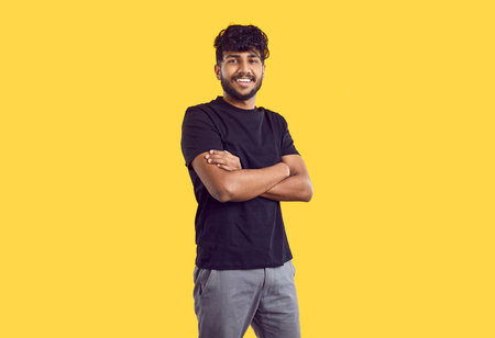 Studio shot of happy young man in casual wear. Handsome Indian guy with modern haircut in black Tshirt standing with his arms folded isolated on yellow background, looking at camera and smiling
