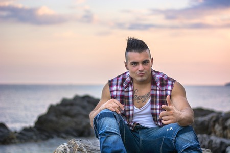 Handsome young man wearing white sweater and ripped jeans, on dark background in studio shot