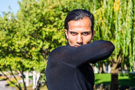 Stylish indian beard man shows his muscle hand. India model posed at green garden of city.