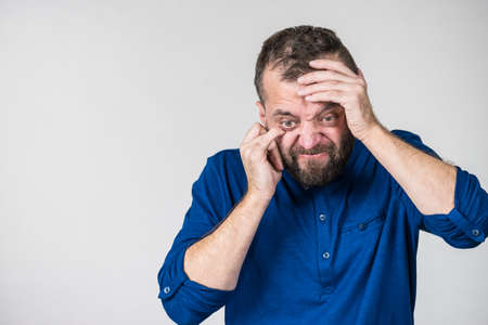Furious bearded adult man, guy acting crazy being mad having mental crisis