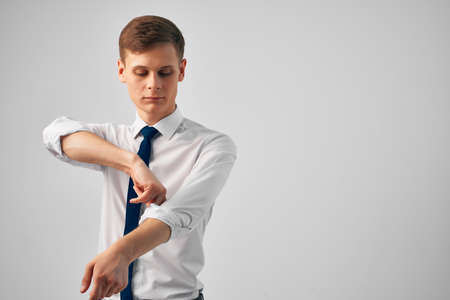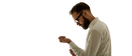 Closeup portrait from the side of handsome man in studio. Model fastens button on his sleeve of white shirt isolated on white background. Morning routine concept