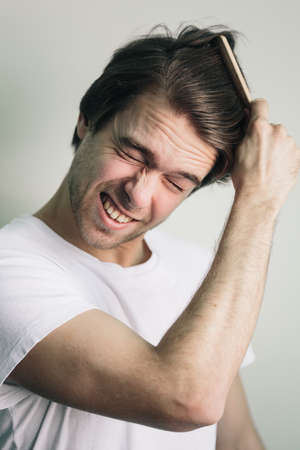 Portrait of handsome young man combing his hair in bathroom of grey background.