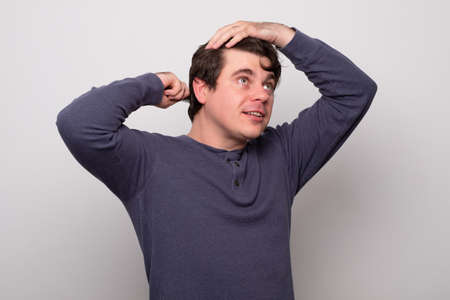Man in grey t-shirt scratches agnail on finger suffering from neurosis on blurred beige background in light room extreme close crop view