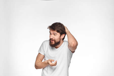 A bearded man in a white T-shirt gestures with his hands emotions blue background