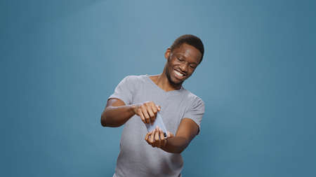 Man with disgruntled facial expression gesturing with hands studio lifestyle blue background
