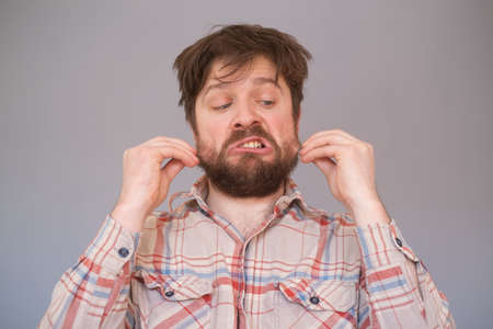 cheerful emotional bearded man gesturing with his hands close-up light background