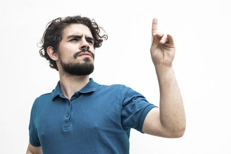 Focused guy pointing index finger up, pressing button on glass screen. Handsome bearded young man in blue casual t-shirt posing isolated over white background. Advertising or technology concept