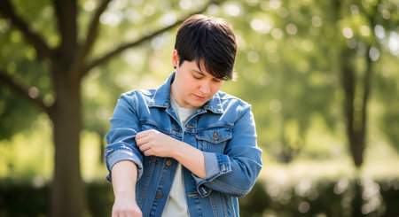 A person with short dark hair stands outdoors in a park, rolling up the sleeves of a blue denim jacket. The background features blurred green trees and dappled sunlight, suggesting a casual, active day.