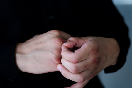 Man scratch oneself, dry flaky skin on hand with psoriasis vulgaris, eczema and other skin conditions like fungus, plaque, rash and patches. Autoimmune genetic disease.