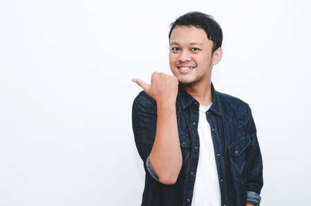 Portrait of smiling dreaming thoughtful young man casual clothing, isolated over blue color background. Male caucasian model at studio. Copy space empty area place for some text.