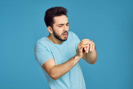 Asian young man scratching his hand isolated on blue background. Concept of itchy skin diseases such as scabies, fungal infection, eczema, psoriasis, rash, allergy, etc.