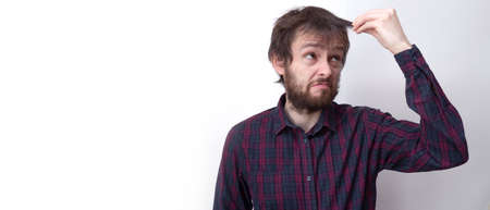 Self Confident guy dressed in a plaid shirt is on a white background in the studio