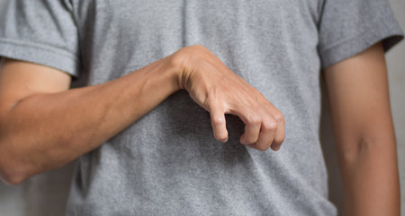Man scratch oneself, dry flaky skin on hand with psoriasis vulgaris, eczema and other skin conditions like fungus, plaque, rash and patches.