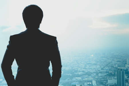 Silhouette of businessman on abstract city background with double exposure of skyscrapers. Concept of leadership and success. Toned image