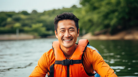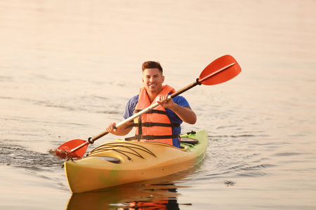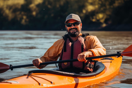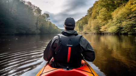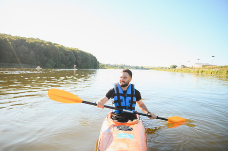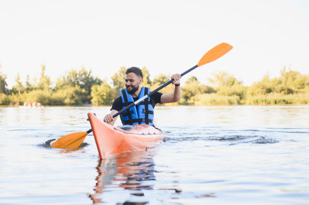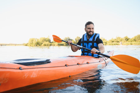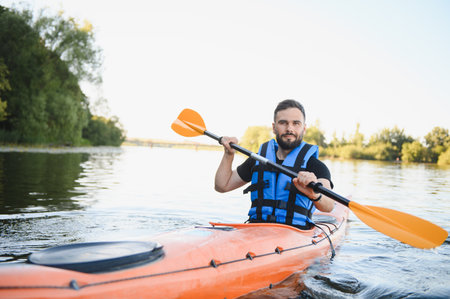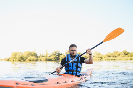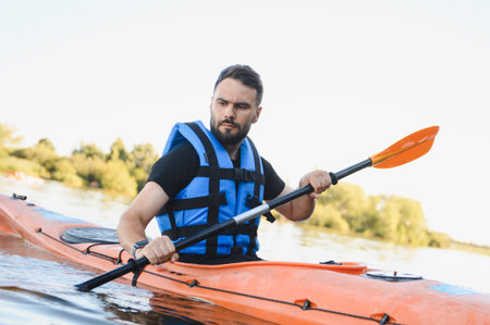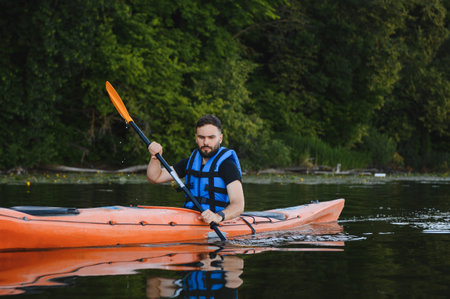 Man paddling kayak on river wearing life jacket, enjoying water sport and active recreation in nature